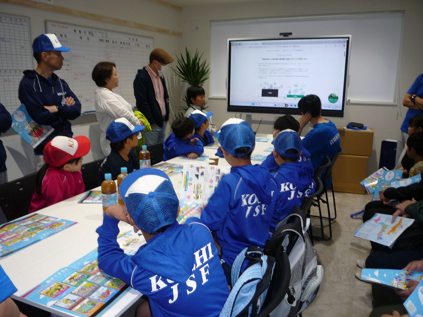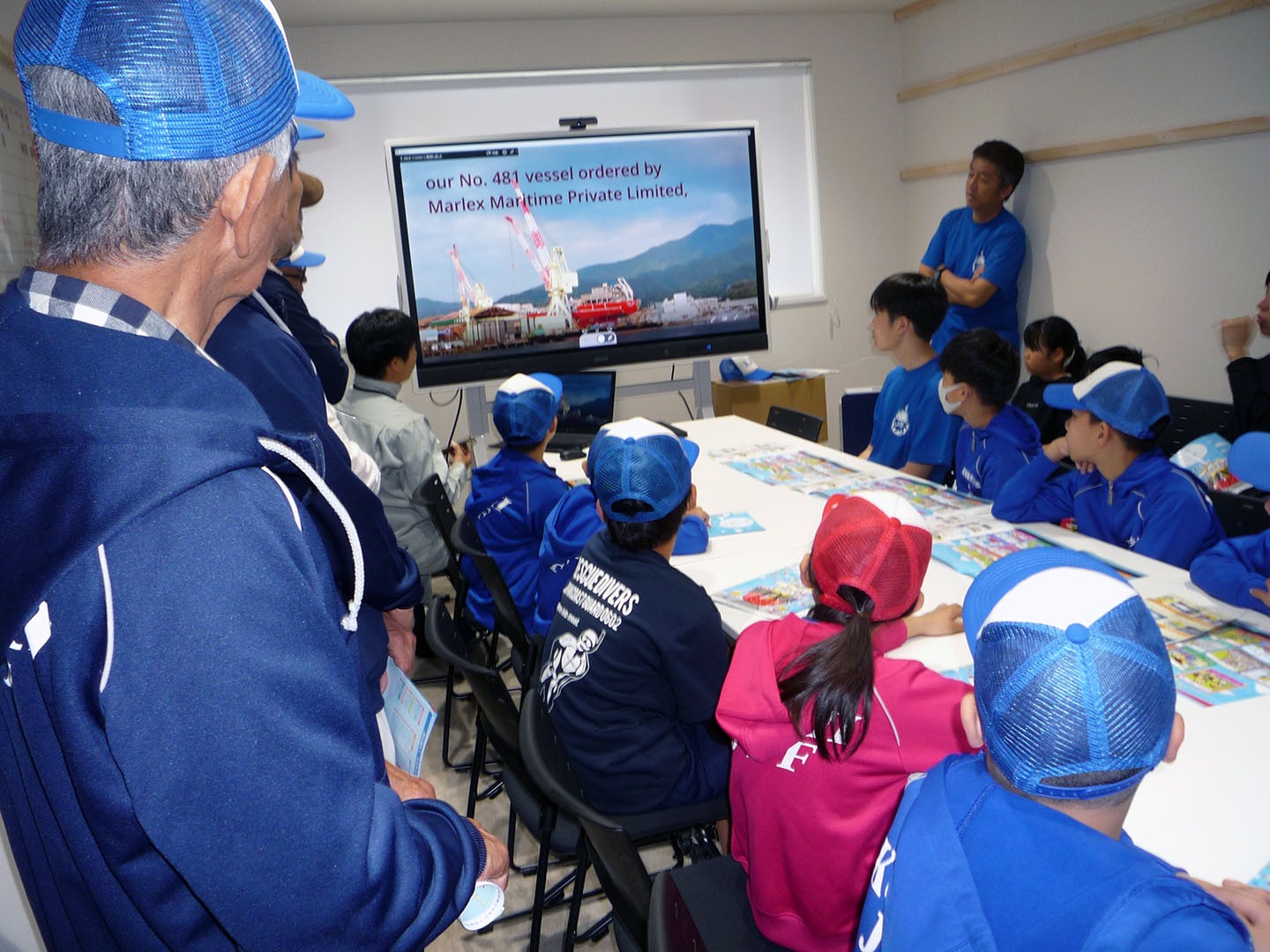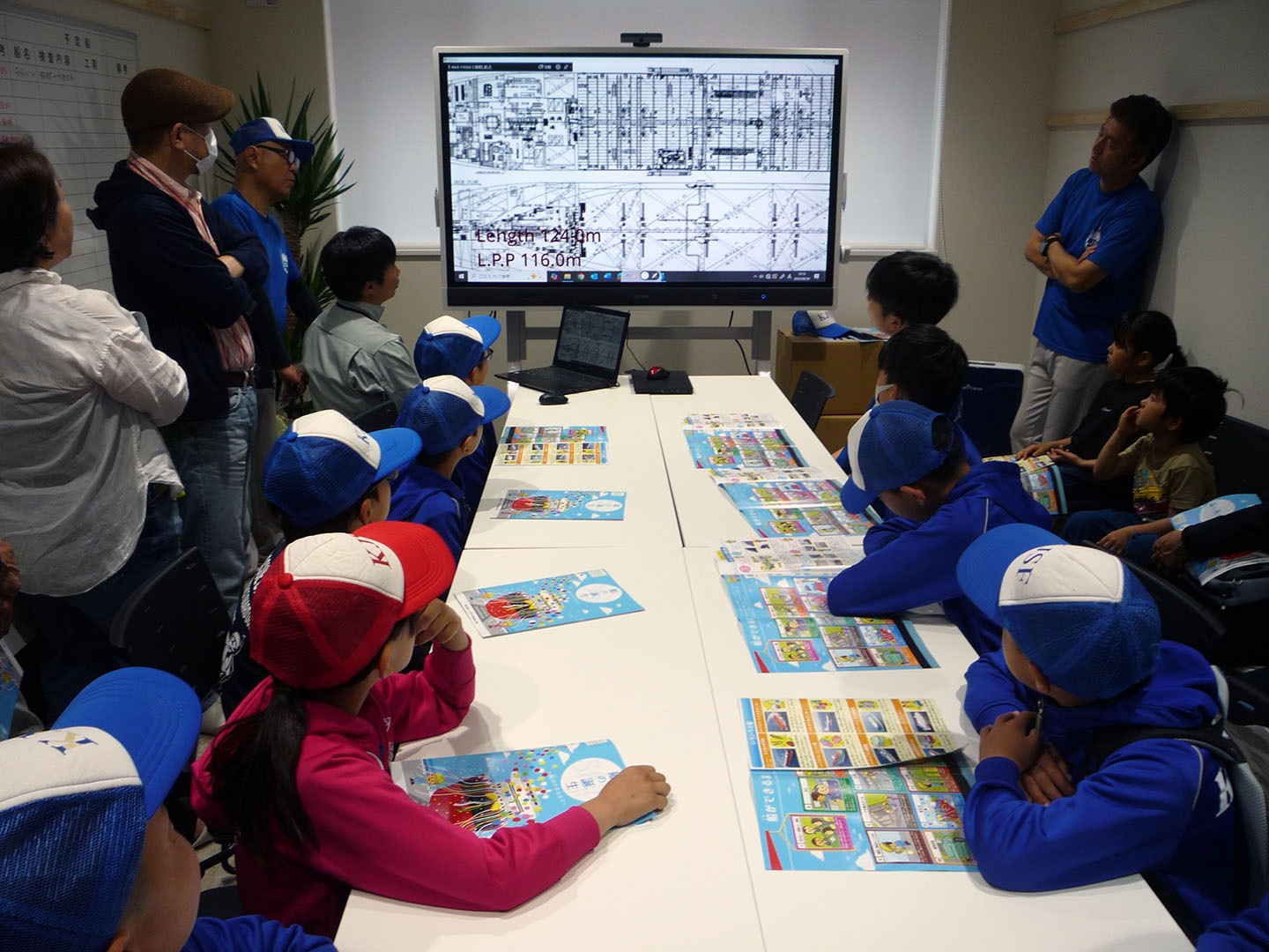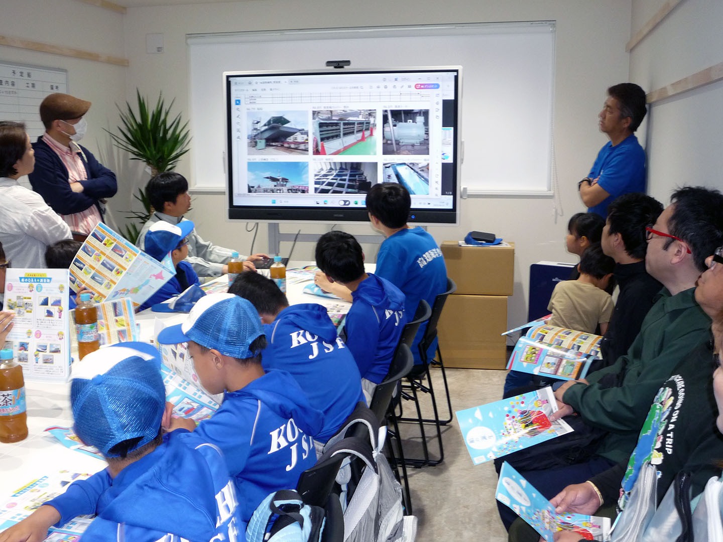 最初に大永造船所の社長:榊原さんから、船を建造する仕事の「造船」について、日本中小型造船工業会から提供を受けたパンフレットを見ながら説明して頂き、その後、大永造船所で建造された県営渡船「浦戸」(電動)についての説明を聞きました。