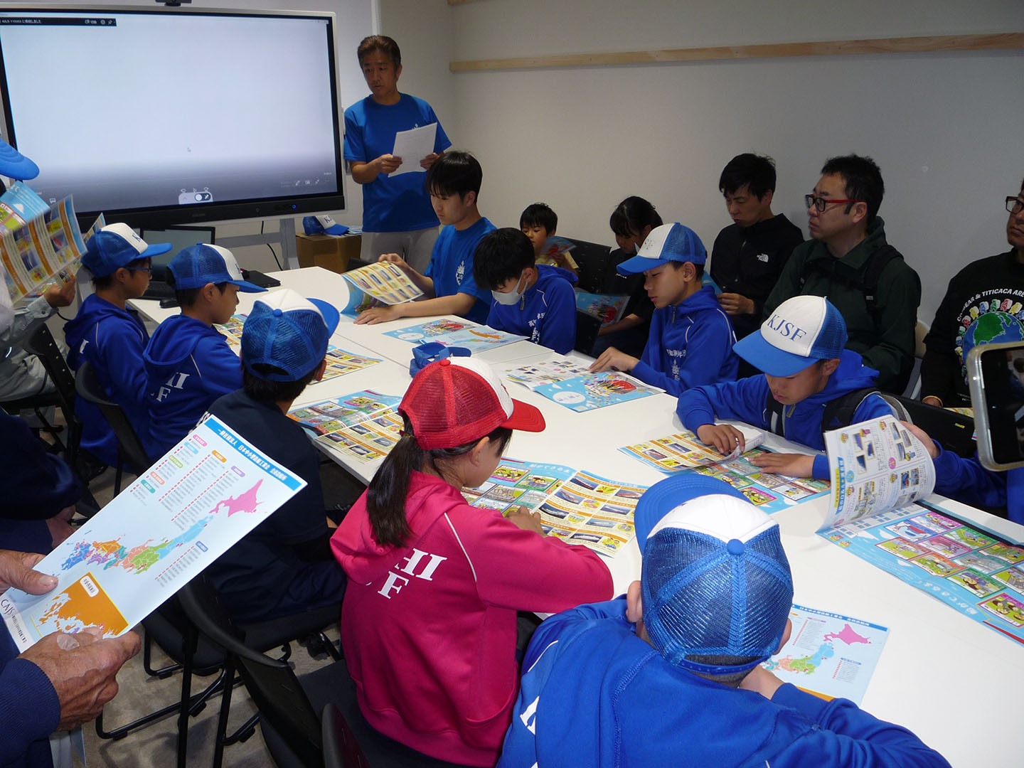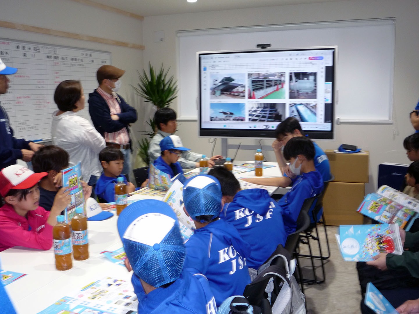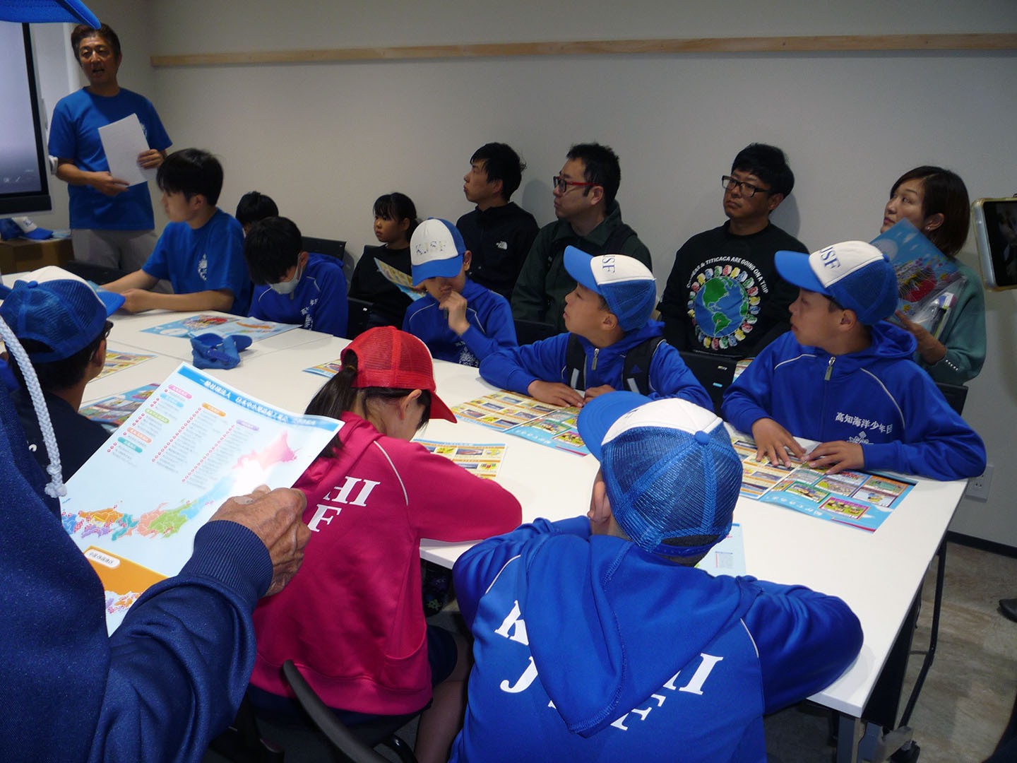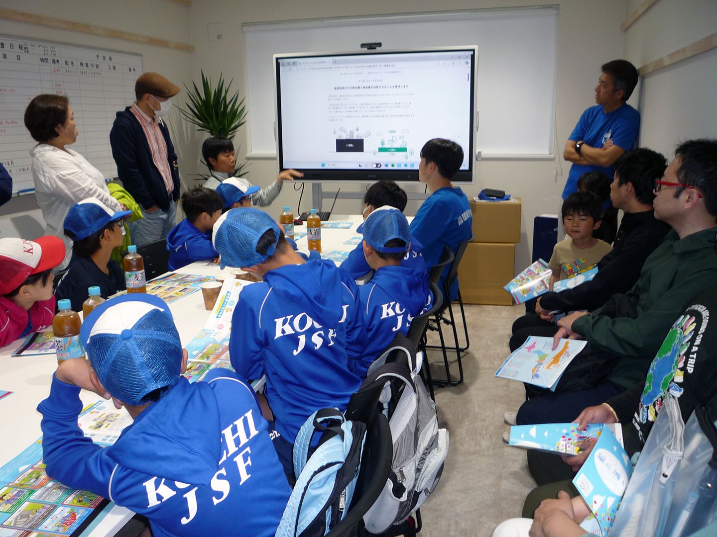 最初に大永造船所の社長:榊原さんから、船を建造する仕事の「造船」について、日本中小型造船工業会から提供を受けたパンフレットを見ながら説明して頂き、その後、大永造船所で建造された県営渡船「浦戸」(電動)についての説明を聞きました。