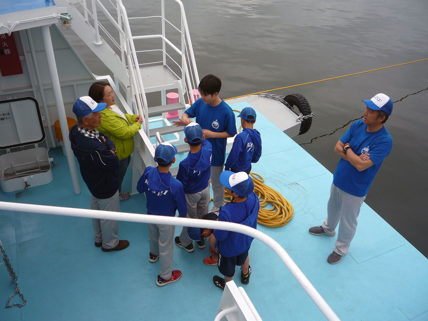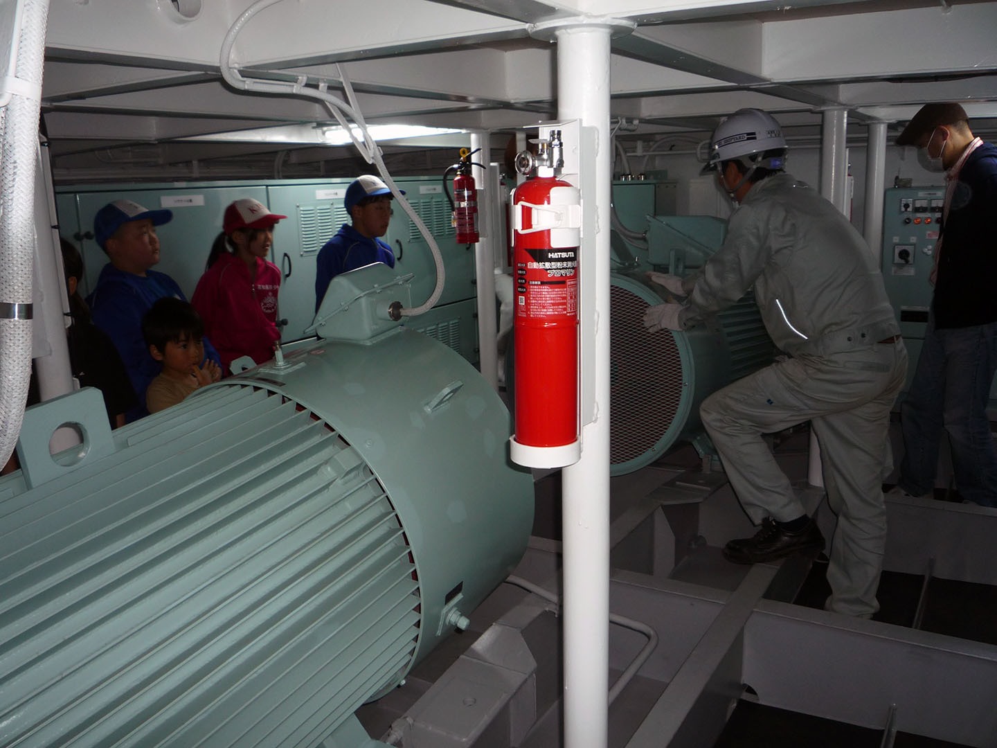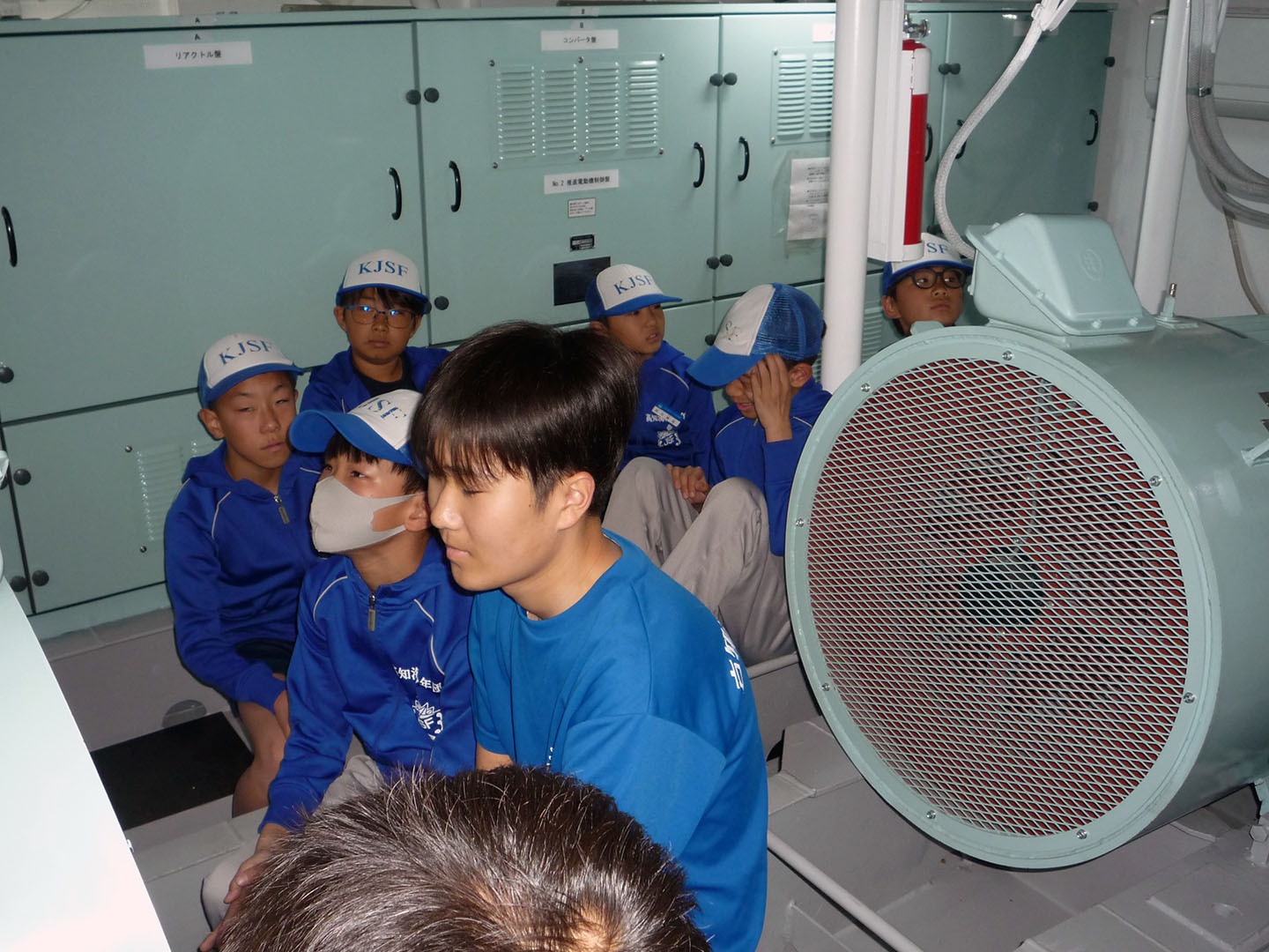 その後、団員たちは、新造の「浦戸」に乗船し、操縦室や船底にある「バッテリー室」と「電気モーター室」を見学しました。建造担当者から渡船「浦戸」が定期航路では全国初の電気推進で運行することや「エンジン音がせず、排気ガスも出さない」と環境にやさしい船であると説明を受け、驚いたのと、自分たちの住む高知県の渡船が、全国初であることを知り嬉しい見学会になりました。